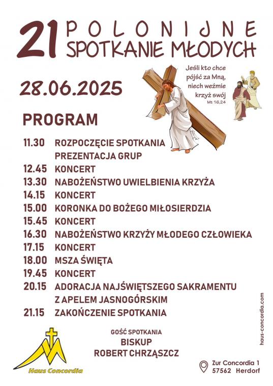 W sobotę 24 czerwca w „Haus Concordia” (Niemcy) odbyło się XIX Polonijne Spotkanie Młodych. Wzięło w nim udział ok. 3 tys. młodych Polaków z Niemiec, Holandii i Belgii. Gościem wydarzenia był delegat Konferencji Episkopatu Polski ds. Duszpasterstwa Emigracji Polskiej bp Piotr Turzyński. Jak podkreślił, w wydarzeniu biorą udział nie tylko młodzi Polacy, ale też ich rodziny. „Klimat jest niezwykły. To jest wyjątkowe spotkanie w wyjątkowym miejscu” – powiedział delegat.