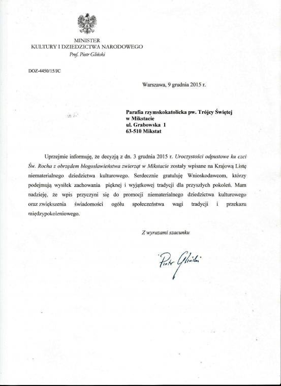 Ważny w wydarzenie i wyróżnienia był ten rok dla znajdującego się na terenie parafii Diecezjalnego Sanktuarium Świętego Rocha. 14 października podczas  Gali Niematerialnego Dziedzictwa Kulturowego w Krakowskich Sukiennicach ks. kan. Krzysztof Ordziniak,  który jest Kustoszem sanktuarium  odebrał decyzję  Ministra Kultury i Dziedzictwa Narodowego o  wpisie uroczystości odpustowych ku czci Świętego Rocha z obrzędem błogosławieństwa zwierząt na Krajową Listę Niematerialnego dziedzictwa kulturowego. Jesteśmy jedyną parafią w Wielkopolsce, która znajduje się na tej reprezentatywnej liście. W  listopadzie podczas obchodów 25 -lecia Opolskiej Izby Lekarsko- Weterynaryjnej ks. kan. Krzysztof odebrał medal  Świętego Rocha przyznany dla sanktuarium za promocję Świętego Rocha -  patrona lekarzy weterynarii.