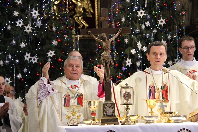 Mszy św. przewodniczył bp Mirosław Milewski, biskup pomocniczy diecezji płockiej. Wraz z nim modlili się: biskup kaliski Edward Janiak, biskup pomocniczy Łukasz Buzun, bp senior Stanisław Napierała, bp senior Teofil Wilski, o. Tadeusz Rydzyk, kilkudziesięciu kapłanów, wierni z diecezji kaliskiej, a szczególnie dekanatów kaliskiego pierwszego, ostrowskiego pierwszego i opatóweckiego oraz osoby konsekrowane z diecezji kaliskiej i pielgrzymi z całej Polski. W homilii bp Milewski dziękował osobom konsekrowanym za gorliwą służbę w Kościele. - Dziś dziękujemy tym zastępom Waszych współbraci i Was za świadectwo życia zakonnego. Nie byłoby roku 1918, ale też nie byłoby roku 1989, gdyby nie Wasza mrówcza, mozolna, ukryta, a nierzadko szykanowana przez władze PRL praca u podstaw, z najbardziej tego potrzebującymi. W dzieło misji prorockiej wpisały się przez wiele wieków dziesiątki tysięcy zakonników, idących z posługą słowa. Od pierwszych benedyktynów, którzy przynieśli tak wielu z naszych przodków chrzest, przez franciszkanów i dominikanów, tłumaczących zawiłości wiary, jezuitów i redemptorystów – mistrzów słowa i jego przekazu, aż po salezjanów, pracujących cierpliwie z młodzieżą – podkreślał hierarcha. Wskazywał też na rolę, jaką w Polsce odgrywają media katolickie, szczególnie Radio Maryja i Telewizja Trwam. - O ile trudniej byłoby dzisiaj w Polsce mówić o Bogu i Jego Kościele, gdyby nie wkład tych właśnie mediów w tak bardzo zróżnicowany polski rynek radiowo-telewizyjny. O ile trudniej żyłoby się milionom Polaków, starszych i młodszych, pracujących i emerytów, gdyby nie wspólna modlitwa na tych antenach, katechezy, dyskusje, rozmowy niedokończone. O ile trudniej byłoby zrozumieć polską rzeczywistość, gdyby nie te – czasami bardzo wyraźne – znaki sprzeciwu – powiedział biskup pomocniczy diecezji płockiej. Zachęcał wiernych, aby prosili Boga o światło dla siebie i swoich najbliższych. - Z gromnicami w ręku, jak nasi ojcowie, przychodzimy w to dzisiejsze święto, aby prosić Boga o światło. Potrzebują tego światła nasze rodziny, tak bardzo zranione różnymi bolesnymi sytuacjami: brakiem dzieci, chorobami, rozwodami, zazdrością. Potrzebują go nasze szkoły, zwłaszcza katolickie, w dobie reorganizacji, by były miejscem wychowania i zdobywania wiedzy – zaznaczył celebrans. Prosił też o światło dla wspólnot diecezjalnych, parafialnych i lokalnych. - Potrzebują tego światła nasze parafie i diecezje, a zwłaszcza seminaria duchowne i nowicjaty zakonne, gdzie czasem płomień zapału przygasa i woła o nowych, młodych, którzy wezmą do ręki tę pochodnię Kościoła. Potrzebują tego światła nasze lokalne wspólnoty, nasze „małe ojczyzny”, bo czasem nazbyt mocno zapanowały tam ciemności. Potrzebują tego światła katolickie media, by jego blask zadziwiał ludzi i przyciągał do wiary i zaufania Bogu. Potrzebuje tego światła każdy z nas, by „światłość w ciemności świeciła i ciemności jej nie ogarnęły” – mówił bp Milewski.