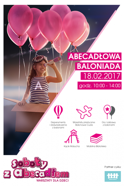 W programie m.in. eksperymenty i doświadczenia z balonami,warsztaty plastyczne: Balonowe Cuda, gry i zabawy, Kącik Malucha oraz Mobilna Biblioteka. Spotkanie odbywa się  w ramach cyklu ,,Soboty z Abecadłem".