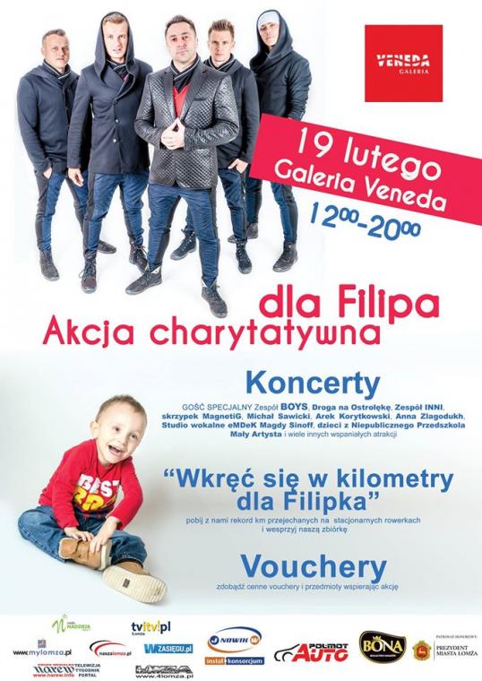 19 lutego (w niedzielę) od godziny 12 do 20 będzie można pomóc 5-letniemu Filipowi w Galerii Veneda w Łomży (woj.podlaskim). W programie m.in. koncert zespołu Boys i wielu innych, a także bicie rekordu na przejechanie jak największej liczby kilometrów na rowerkach stacjonarnych.