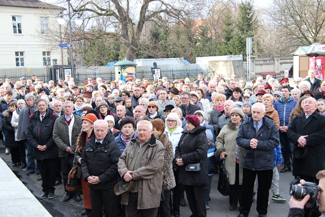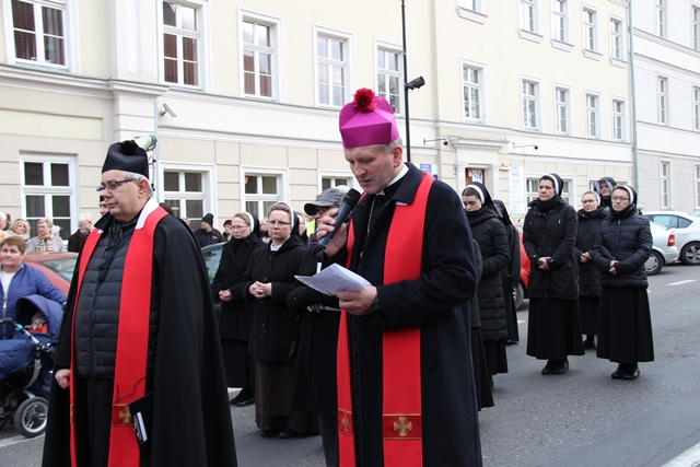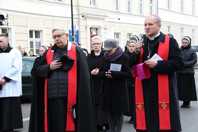 Nabożeństwo zakończyło się przy kościele Świętej Rodziny, gdzie słowo do wiernych skierował bp Łukasz Buzun. – Kończymy rozważania w tajemnicy drogi krzyżowej. Idąc za Jezusem na drodze krzyża i patrząc na swoje rany zrozumieliśmy, że sami nie poradzimy sobie z grzechami, które zraniły nas i innych. Zrozumieliśmy, że mamy uchwycić się zbawczego krzyża Jezusa, ufając Jemu, a nie samemu sobie. Prosimy Cię Panie o łaskę otwarcia naszego serca i umysłu i o to abyś prowadził nas ku zbawieniu – powiedział biskup pomocniczy diecezji kaliskiej. Podziękował kapłanom, klerykom, siostrom zakonnym i wszystkim wiernym za wspólną modlitwę. Dziękował też jezuitom za zorganizowanie drogi krzyżowej z superiorem o. Andrzejem Lemieszem, a także policji, straży miejskiej, straży pożarnej i wszystkim służbom porządkowym.