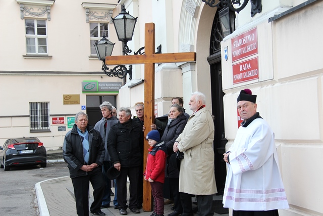 Droga krzyżowa rozpoczęła się przy Grocie Katyńskiej na placu przy Sanktuarium Serca Jezusa Miłosiernego Ojców Jezuitów. Trzymetrowy drewniany krzyż nieśli wierni kaliskich parafii, więźniowie, podopieczni Schroniska św. Brata Alberta, strażacy, młodzież.