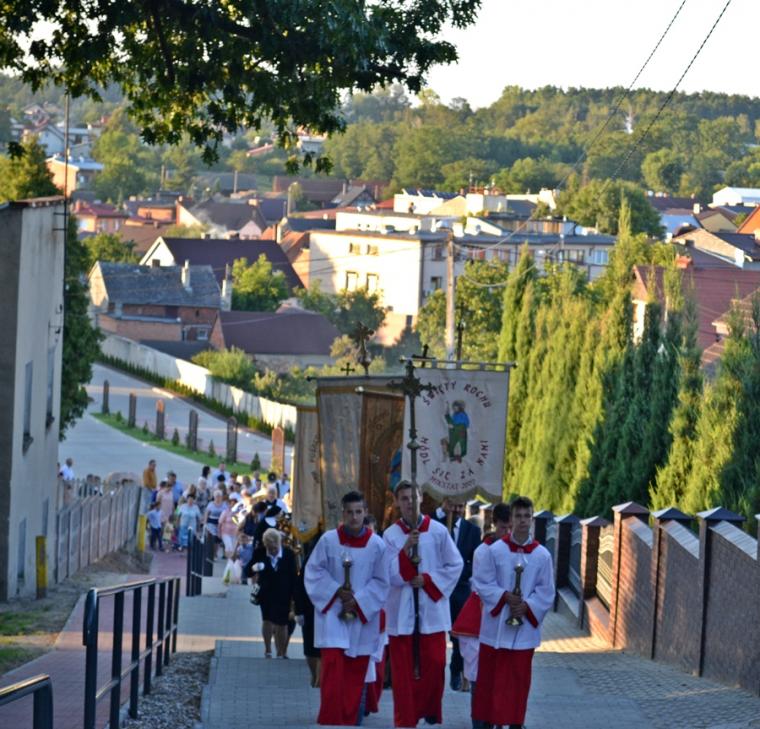 Uroczystości odpustowe ku czci św. Rocha to jedno z najważniejszych wydarzeń w roku w mikstackiej wspólnocie parafialnej. Już 7 sierpnia rozpoczęły się duchowe przygotowania do tej uroczystości. Młodzi parafianie spotykali się w Szkole św. Rocha. Wielu parafian codziennie o godz. 18:30 uczestniczyło we Mszy św. połączonej z Nowenną do św. Rocha. W przedodpustowych dniach nauki rekolekcyjne głosił ks. kan. Bogumił Kempa. W uroczystość Wniebowzięcia Matki Bożej o godz. 18:00 w kościele farnym sprawowana była Msza św. podczas której wysłuchaliśmy ostatniej nauki rekolekcyjnej. Ks. Bogumił podkreślał w niej miłość Boga do człowieka. Zaakcentował, że Bóg wybierając Maryję na Matkę Jezusa chciał być blisko człowieka. Nawiązując do Święta Wojska Polskiego zapytał o jaką Polskę walczyli i za jaką Polskę ginęli nasi rodacy. Podkreślił, że powinniśmy być dumni z tego, że jesteśmy Polakami, z tego że mamy, tu w Mikstacie naszego świętego Rocha. Podkreślił znaczenia tradycji w życiu wspólnoty. Wiele ważnych słów skierował do nas podczas rekolekcyjnych nauk, zachęcających do przemiany życia, pracy nad sobą, do naśladowania naszego niebieskiego Patrona. Z pewnością pomogły nam one w przygotowaniu pięknego, szczególnego odpustowego czasu. A ten właśnie w Diecezjalnym Sanktuarium Świętego Rocha w Mikstacie trwa. Po Mszy św. z kościoła farnego wyruszyła uroczysta procesja z Najświętszym Sakramentem i relikwiami niebieskiego Patrona na Wzgórze Mikstackie, gdzie znajduje się Diecezjalne Sanktuarium Świętego Rocha. W procesji uczestniczyli kapłani posługujący na co dzień w mikstackiej wspólnocie, z niej pochodzący oraz liczna rzesza parafian, gości i pielgrzymów. Z feretronami, sztandarami przy dźwiękach orkiestry parafialnej przeszliśmy na miejsce głównych uroczystości. Po przybyciu do Sanktuarium odśpiewane zostały uroczyste nieszpory i odprawiona Nowenna do Świętego Rocha. Po Nowennie rozpoczęło się całonocne czuwanie modlitewne. Wiele osób w tej nocnej ciszy zapewne nawiedzi Sanktuarium, by z Jezusem ukrytym w Najświętszym Sakramencie i naszym patronem Świętym Rochem podzielić się swoimi radościami i troskami, by podziękować za otrzymane łaski i prosić o dalszą opiekę i wsparcie.