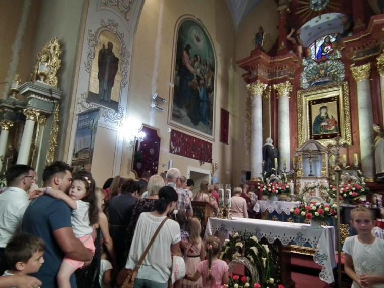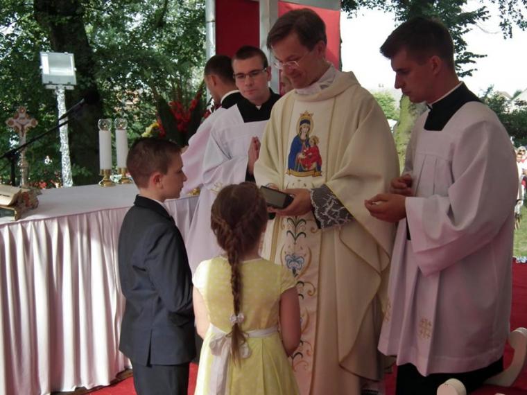 Gwarno zrobiło się wokół sanktuarium około godz. 16:00. Na tę godzinę do Matki Bożej Pocieszenia zostały w sposób szczególny zaproszone rodziny z dziećmi. „Pozwólcie dzieciom przychodzić do Mnie, nie przeszkadzajcie im…” powiedział Pan Jezus do apostołów. Nie zabraniali, nie przeszkadzali w przyjściu do Jezusa licznie zebranym u Lutogniewskiej Pani dzieciom rodzice. Przyszli z nimi, przyprowadzili je, przynieśli na rękach, przywieźli w wózkach, by mogły otrzymać indywidualne błogosławieństwo. Mszy św. w intencji rodzin przewodniczył ks. dr Jarosław Powąska. Potem wszystkim dzieciom i tym maleńkim i tym większym kapłani udzielili indywidualnego błogosławieństwa. Nie zabrakło niespodzianki dla najmłodszych czcicieli Matki Bożej Pocieszenia. Radowało się serce kustosza sanktuarium tak licznym udziałem rodzin w uroczystościach odpustowych. Rodzice i dziadkowi, którzy przybyli do Lutogniewskiej Matki z najmłodszymi dali piękne świadectwo wiary i zaufania Matce i Jego Synowi.” Słowa uczą, ale przykład pociąga…”. Można więc mieć nadzieję, że rośnie kolejne pokolenie czcicieli Matki Boże Pocieszenia z Lutogniewa.