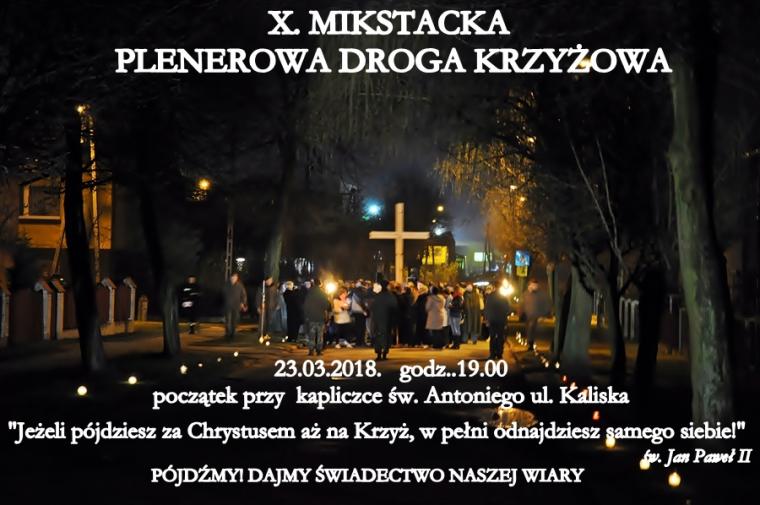 Jest tradycją w mikstackiej  parafii, że w piątek przed Niedzielą Palmową odbywa się Droga Krzyżowa ulicami miasta. W tym roku 23. marca i  poprzedza dzień sakramentu pokuty i pojednania w parafii. Stanowi więc okazję do rachunku sumienia z naszej miłości względem Boga i bliźnich. Jest czasem szczególnego wyciszenia. Wydaje się, że tak niedawno po raz pierwszy w okresie Wielkiego Postu wyruszyliśmy za krzyżem ulicami miasta… Okazuje się, że w tym roku uczynimy to po raz dziesiąty. Przeżywać więc będziemy mały jubileusz. Może stanie się on okazją do jeszcze liczniejszego udziału  w naszej Mikstackiej Plenerowej Drodze Krzyżowej?