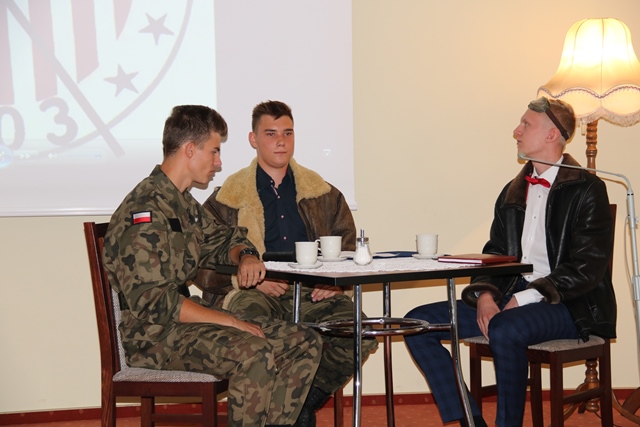 Zebrani w szkole mieli okazję obejrzeć program artystyczny w wykonaniu uczniów przedstawiający działalność Dywizjonu 303.