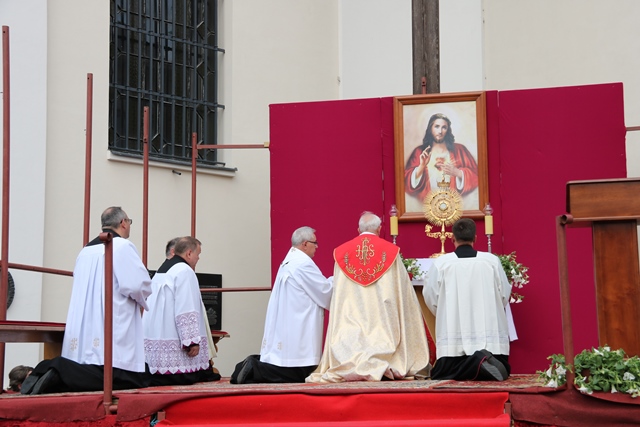 Po nabożeństwie procesja wyruszyła w drogę powrotną do Sanktuarium Serca Jezusa Miłosiernego. Na skrzyżowaniu ulic 3 Maja, Warszawskiej i Stawiszyńskiej bp Stanisław Napierała udzielił błogosławieństwa Najświętszym Sakramentem na cztery strony świata.