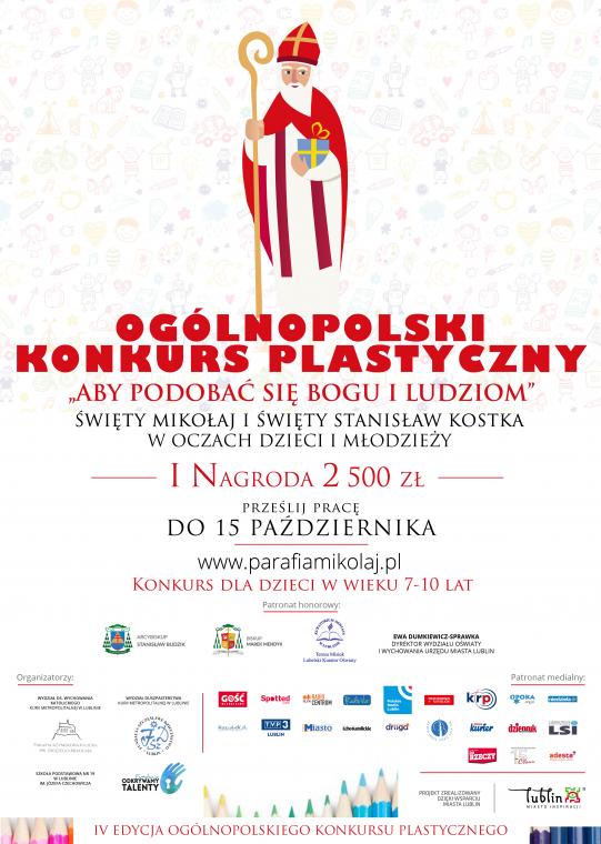 Rozpoczęto IV edycje ogólnopolskiego konkursu plastyczno-literackiego organizowanego przez parafię pw. św. Mikołaja w Lublinie. Konkurs wpisuje się w tradycyjne już lubelskie wydarzenie – Orszak św. Mikołaja. Jest on adresowany do uczniów klas siódmych i ósmych szkół podstawowych, oddziałów gimnazjalnych oraz uczniów klas I-III. Na zwycięzców czekają atrakcyjne nagrody finansowe w wysokości 2500 zł, 1500 zł i 1000 zł, warto, więc spróbować swoich sił w obszarze plastycznym lub literackim. Prace konkursowe będą przyjmowane do 15 października 2018 r.