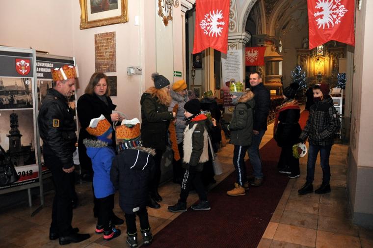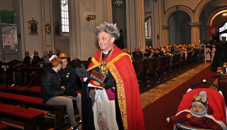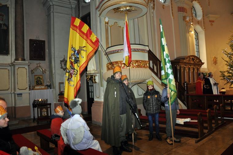 Około godz. 14:00 w kościele pw. Świętej Trójcy zaczęli zbierać się uczestnicy Królewskiego Orszaku. Tu odbyła się jego pierwsza część, którą poprowadził ks. Szymon Grzeszkiewicz, proboszcz parafii pw. Zwiastowania Pańskiego. Rozpoczynając ks. Szymon podkreślił, że spotykamy się po raz pierwszy, wspólnie, dekanalnie, by obchodzić obchodach Święta Objawienia Pańskiego, by wziąć udział w Orszaku Królewskim. Zaakcentował, że uczestnicy  Orszaku podobnie jak Mędrcy ze Wschodu udają się, by oddać pokłon Jezusowi, ale także dać świadectwo swojej wiary. Następnie ks. Szymon skierował słowa powitania do wszystkich tych, którzy przybyli wraz ze swoimi parafiami. W postacie królów wcielili się księża proboszczowie. Kapłan podkreślił, że Orszak Trzech Króli, nie ma długiej tradycji, ale coraz więcej miejscowości włącza się w tę radosną formę świętowania i wspólnego kolędowania.