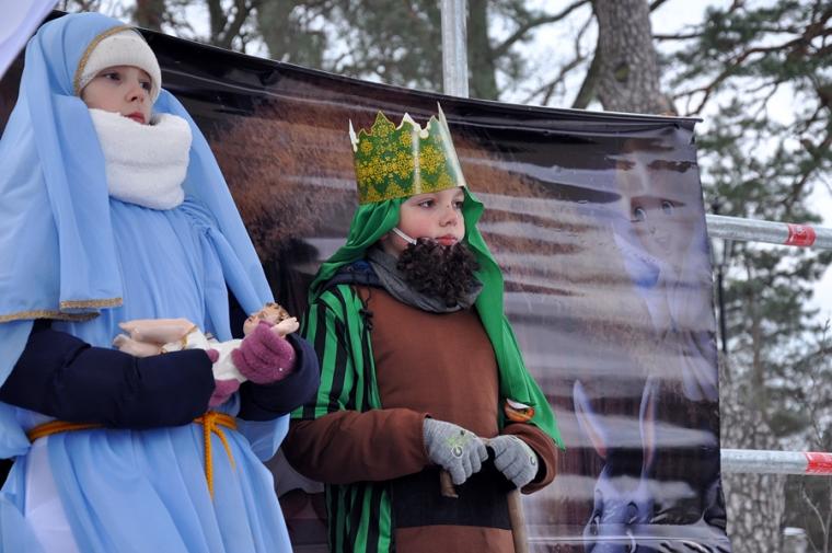 Z Rynku uczestnicy  orszaku ulicami miasteczka udali się w kierunki Diecezjalnego Sanktuarium Świętego Rocha. Zatrzymał się na schodach prowadzących do sanktuarium, gdzie ks. kan. Krzysztof  odczytał fragment Ewangelii św. Mateusza.   Tu zaprezentowana została scenka przedstawiająca pokłon Mędrców ze Wschodu Bożej Dziecinie i złożenie darów. W dalszą drogę Królewski Orszak wyruszył już z Dzieciątkiem Jezus w kierunku parkingu przy sanktuarium. Podczas całej orszakowej drogi śpiewano kolędy. Na parkingu uczestnicy Orszaku obejrzeli jasełka przygotowane przez uczniów szkoły podstawowej z Kaliszkowic Ołobockich.