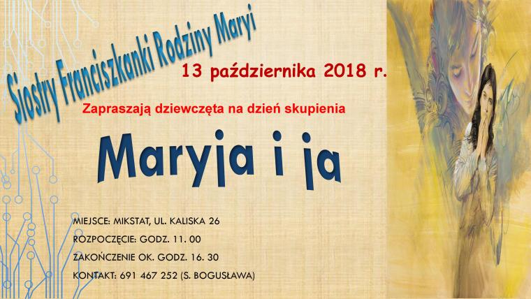 Zastanawiasz się co będziesz robiła w sobotni dzień, jak go spędzisz.  Może skorzystasz z propozycji i zaproszenia Sióstr Franciszkanek Rodziny Maryi, które  zapraszają dziewczęta do swego Domu Zakonnego w Mikstacie przy ulicy Kaliskiej  na dzień skupienia. Zobacz, jaki piękny dzień wybrały Siostry na ten czas pogłębiania więzi z Jezusem i Jego  Matką. Dzień Fatimski w miesiącu różańcowym  i hasło dnia skupienia „ Maryja i ja”. Czy może być piękniejszy wzór życia dla młodej dziewczyny niż Maryja?