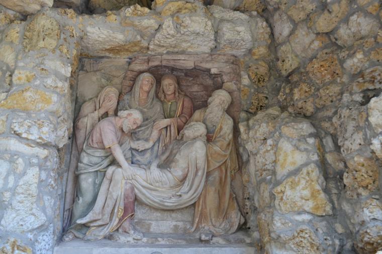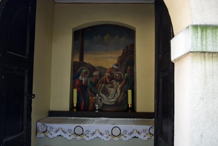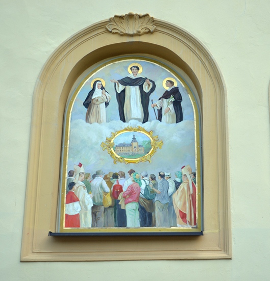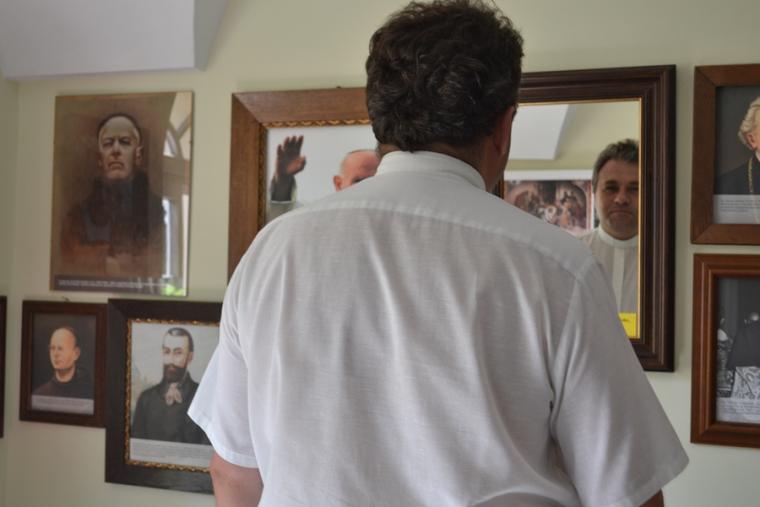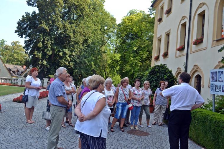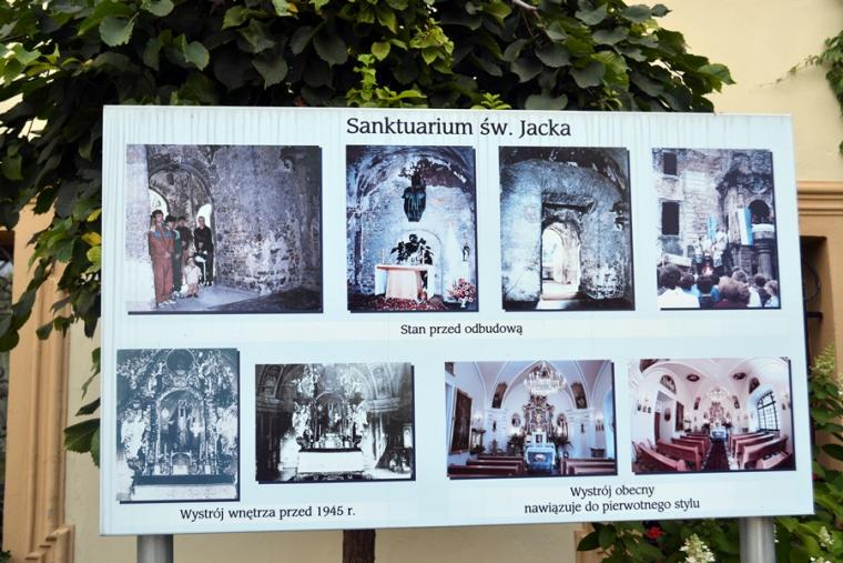 Kolejnym miejscem, które nawiedziliśmy był Kamień Śląski. Tu na świat przyszedł przyszły święty Jacek Odrowąż, bł. Czesław i bł. Bronisława. Kaplica poświęcona św. Jackowi powstała w XVIII wieku. Zachwyca swoim wystrojem. W centralnym punkcie ołtarza umieszczona jest statua św. Jacka. Po jej bokach znajdują się figury bł. Czesława i bł. Bronisławy. Na sklepieniu kaplicy podziwiać można przepiękne malowidła przedstawiające cztery sceny z życia Maryi: „Zwiastowanie", „Narodziny Jezusa w Betlejem", „Ofiarowanie Jezusa w świątyni", „Śmierć Maryi-Wniebowzięcie". W kaplicy codziennie od rana do zmierzchu odbywa się adoracja Najświętszego Sakramentu. Oczywiście nawiedziliśmy kaplicę sanktuarium św. Jacka, pokłoniliśmy się Jezusowi ukrytemu w Najświętszym Sakramencie. Wspólnie odmówiliśmy litanie do św. Jacka, a następnie był czas na indywidualna modlitwę oraz chwilę odpoczynku w parku pałacowym. Miejsce przepiękne, a niewielka kaplica stwarza atmosferę do refleksji i modlitewnej zadumy. Otaczający pałac park ze starymi drzewami i ptactwem pozwalał zachwycić się pięknem świata stworzonego przez Boga. Przemierzając alejki, w cieniu drzew w niewielkiej kapliczce można było spotkać Chrystusa frasobliwego. Dobrze nam było u św. Jacka w Kamieniu Śląskim, ale trzeba było wyruszyć dalej na pielgrzymi szlak.