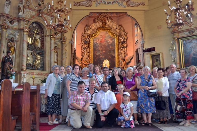 Pierwszym miejscem, które nawiedziliśmy w upalny sobotni dzień był położony na wzgórzu kościół pw. Świętego Rocha w Dobrzeniu Wielkim. To miejsce dla nas szczególne. Podobnie jak w Mikstacie znajduje się tu zabytkowy drewniany kościół pw. Świętego Rocha. W Dobrzeniu, podobnie jak w naszej parafii wierni czczą św. Rocha. Przy kościele oczekiwał na nas ks. proboszcz Jan Polok. Ks. Jan jest także wielkim czcicielem św. Rocha i autorem książki dla dzieci pt. Święty Roch pielgrzym miłości. W kościele był czas na chwilę modlitwy, a następnie ks. Jan przekazał nam kilka ciekawostek związanych z budową tej pięknej świątyni. Opowiedział nam o wystroju kościoła zwracając szczególną uwagę na obraz w ołtarzu głównym przedstawiający św. Rocha orędującego u Boga za chorymi. Z zainteresowaniem wysłuchaliśmy informacji o przebiegu uroczystości odpustowych w Dobrzeniu. Zachwycił wielu ten niewielki, ale niezwykle urokliwy kościół. Po wysłuchaniu informacji ks. Jana odmówiliśmy Litanie do Świętego Rocha. Przed świątynią znajduje się figura św. Rocha w stroju pielgrzyma. Pielgrzym to ktoś znajdujący się w drodze. My także pielgrzymowaliśmy. Było nam dobrze u św. Rocha w Dobrzeniu. Niestety, trzeba było wyruszać dalszą drogę.