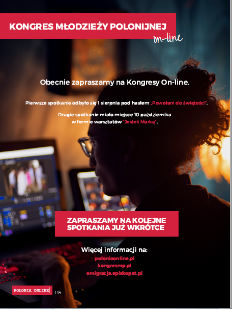 „Powołani do świętości” - pod takim hasłem odbył się 1 sierpnia III Kongres Młodzieży Polonijnej – tym razem online. W tegorocznym Kongresie wzięło udział 200 osób z Niemiec, Wielkiej Brytanii, Francji, Stanów Zjednoczonych, Australii, Brazylii, Mołdawii, Ukrainy, Litwy, Białorusi, Paragwaju, Hiszpanii, Niderlandów, Włoch, Meksyku, Rumunii. W programie spotkania znalazły się: konferencja na temat świętości, świadectwa ludzi młodych z różnych krajów, wspólna modlitwa, wielbienie, dzielenie się swoimi przemyśleniami i propozycjami na przyszłość.