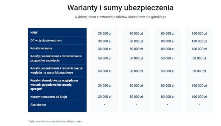 Istnieje możliwość wyboru ubezpieczenia 120-dniowego - na sezon letni lub zimowy lub na cały rok. Najtańszy wariant dla turystów szlakowych kosztuje już 62 zł za 120 dni .