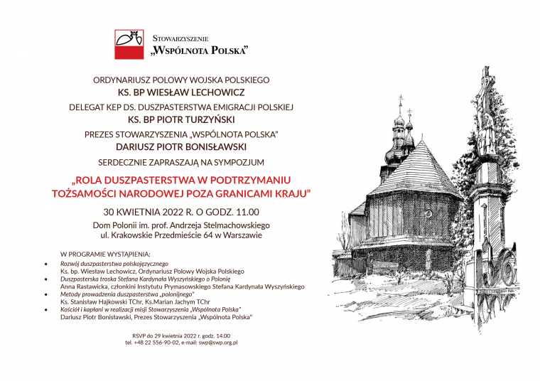 30 kwietnia 2022 r. w w Domu Polonii im. prof. Andrzeja Stelmachowskiego w Warszawie - na zaproszenie Ordynariusza polowego Wojska Polskiego ks. bp Wiesława Lechowicza, delegata KEP ds. duszpasterstwa emigracji polskiej ks. bp Piotra Turzyńskiego oraz prezesa Stowarzyszenia "Wspólnota Polska" Dariusza Piotra Bonisławskiego - odbyło się sympozjum „Rola duszpasterstwa w podtrzymaniu tożsamości narodowej poza granicami kraju”.