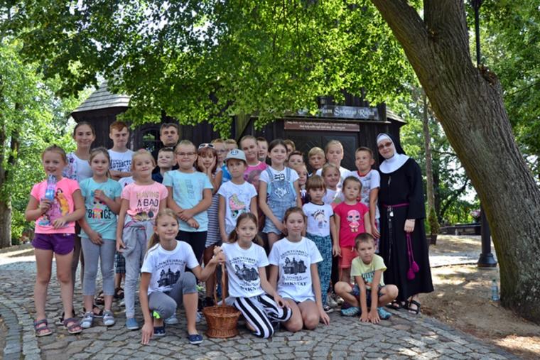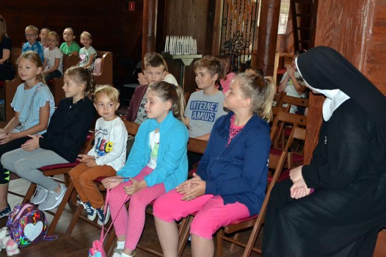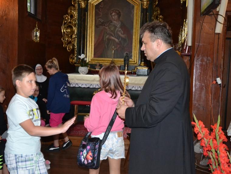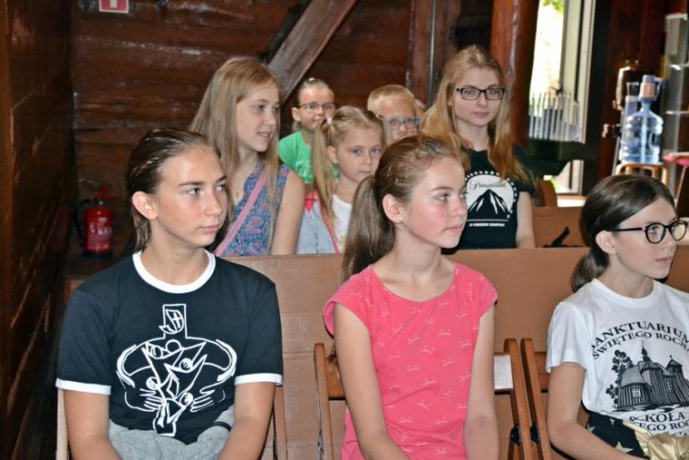 Jak okazało się w drugim dniu spotkań, dzieci sumiennie wykonały pracę domową. Było jeszcze jedno zadanie, gdyż w trakcie tegorocznej Szkoły pojawił się kufer dziedzictwa. Podczas poszczególnych dni dzieci będą wkładały do niego rysunki, fotografie, opisy, tego co składa się na nasze dziedzictwo kulturowe. Na początek dzieci miały przyjrzeć się dziedzictwu należącemu do nich. Kufer w czwartkowe przedpołudnie zaczął się wypełniać. W tym drugim dniu w Rochowej Szkole był oczywiście czas na modlitwę nowennową podczas której ks. kan. Krzysztof odczytywał przyniesione przez młodych intencje. Potem dzieci uczciły relikwie św. Rocha. Po modlitwie przyszedł czas na wspólny śpiew. W jego prowadzeniu niezastąpiona okazała się s. Małgorzata, która pewnie już do końca spotkań w Rochowej Szkole będzie dbała o to, by rozśpiewać dzieci, a także organizować dla nich zabawy ruchowe.Ta wakacyjna szkoła została zorganizowana m.in. po to, by dzieci poznały życie św. Rocha, a także wartości, którymi kierował się On w swoim życiu. W tym celu ksiądz kustosz wykorzystał fragment programu „Ziarno” poświęconego św. Rochowi. Dodajmy, że fragmenty tego programu były realizowane na terenie naszej parafii. Uczestniczyli w nim młodzi Mikstaczanie. W drugim dniu omówione zostały atrybuty, z którymi na obrazach i rzeźbach przedstawiany jest św. Roch. Stało się to impulsem do wskazania podobieństw i różnic w ikonograficznych przedstawieniach św. Rocha i św. Jakuba. Podczas spotkania dzieci obejrzały film animowany „N- jak niewidomy”, w którym mogły zobaczyć w jaki sposób można pomagać osobom niewidomym bądź niedowidzącym. Ksiądz kustosz omawiając strój św. Rocha zwrócił uwagę na laskę pielgrzymią. Z filmu dzieci dowiedziały się, że biała laska może być bardzo pomocna dla osoby niewidomej. Nie zabrakło także opowieści o psach przewodnikach osób niewidomych. Film był forma przygotowania do spotkania z gościem, który tego dnia odwiedził uczestników Szkoły Świętego Rocha. Mamy nadzieję, że spotkanie to na długo pozostanie w ich pamięci. Kim był ten niezwykły gość? Otóż na spotkanie z młodymi przybyła Pani Gabriela Przygoda. Pani Gabriela jest osobą niewidomą, straciła wzrok mając 20 lat. Podczas spotkania Pani Gabrysia przedstawiła się w kilku zdaniach, a następnie bardzo chętnie odpowiadała na pytania młodych, trzeba przyznać, że było ich bardzo wiele. Młodzi pytali m.in. o to jak radzi ona sobie z czynnościami dnia codziennego takimi jak sprzątanie, gotowanie, prasowanie, mycie, poruszanie się po mieszkaniu, dobieranie kolorystyki ubrania, pakowanie walizki na wyjazd. Pani Gabrysia podkreślała, że pomocne są tu często zdobycze techniki. Podkreśliła, że osoby niewidome mają z reguły bardzo uporządkowane życie. Troska o ład ułatwia im funkcjonowanie, gdyż wiedzą wtedy gdzie mogą znaleźć konkretne przedmioty. Jest jeszcze jedna rzecz, którą należy powiedzieć o gości. Pani Gabriela została obdarowana przez Pana Boga pięknym głosem. Dane nam było posłuchać w sanktuarium pieśni Ave Maria Jasnogórska Pani. Może kiedyś uda się Pani Gabrysi wydać płytę, życzymy jej tego z całego serca. Po licznych pytaniach zadanych przez młodych ksiądz kan. Krzysztof zapytał Panią Gabrysię co chciałaby powiedzieć młodym ludziom. Zacytujmy to przesłanie: „Żeby żyli każdym dniem, żyli tak, żeby nikt przez nich nie płakał, bo jeżeli jest się młodym nie zwraca się uwagi na to co się robi, krzywdzi się ludzi, to to wszystko potem wraca, jeżeli się ich nie krzywdzi, a stanie się nam krzywda to ma się pomoc z każdej strony, ale jeśli się tego nie zauważa i tego nie robi to wtedy jest naprawdę ciężko”.