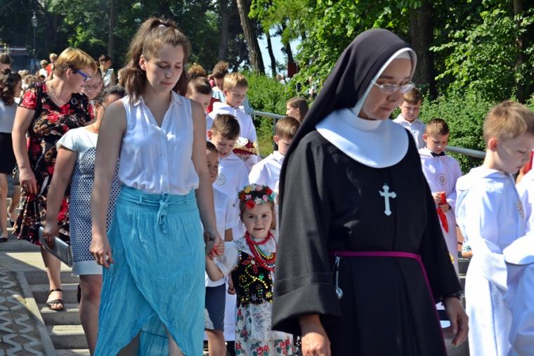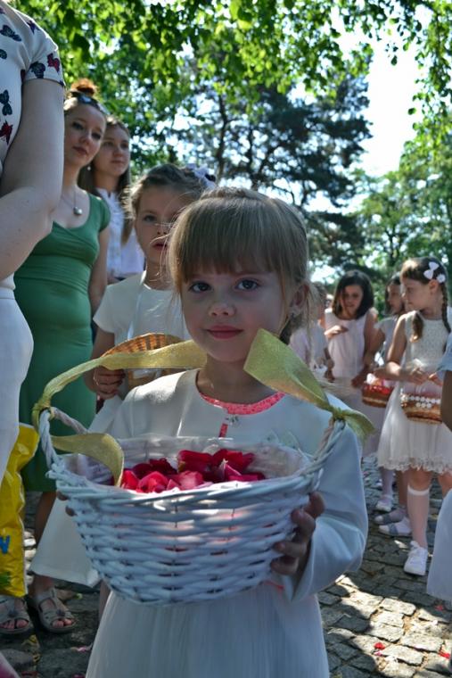 Wracając do głównego wątku rozważania kaznodzieja zachęcał wiernych do postawienia sobie pytania: „Co Jezus ukryty pod postacią Chleba, zobaczy w czasie wędrowania przez nasze miasto i parafię? Jaką zobaczy Ojczyznę, jaki Kościół, jaką rodzinę, jakiego człowieka?”. W dalszej części homilii celebrans podkreślił, że uroczystość Bożego Ciała jest wielkim pokłonem złożonym Jezusowi, ale jednocześnie zachęcał, by odpowiedzieć sobie na pytanie, czy zawsze oddajemy Bogu pokłon. Zaznaczył, że różnie z tym bywa. Myślą przewodnią rozważania były słowa pieśni „ Zróbcie Mu miejsce…”. Kończąc rozważanie ks. kanonik powiedział: „ Mam do Was ogromną prośbę w tym roku, abyśmy zrobili Bogu miejsce w naszych kalendarzach, które są tak mocno zapełnione różnymi sprawami”. Parafia podzielona jest na rejony, jak podkreślił ks. proboszcz nie tylko po to, by wywiązywały się one m.in. z organizacji procesji w poszczególnych dniach, ale i po to, by ich mieszkańcy w tych dniach uczestniczyli w Eucharystii. Jak odpowiemy na to zaproszenie? Czy zrobimy miejsce dla Pana w naszych sercach i w naszych kalendarzach. Tak wielu z nas przyjęło Jezusa w Komunii Świętej. Zrobiliśmy Mu miejsce w naszych sercach. Po Mszy Świętej odbyło się wystawienie Najświętszego Sakramentu, następnie wraz z Jezusem ukrytym pod postacią Chleba wyruszyliśmy w procesji do czterech ołtarzy. Przedstawiciele poszczególnych regionów przygotowali ołtarze. Trasa tegorocznej procesji wiodła od Diecezjalnego Sanktuarium Świętego Rocha do krzyża misyjnego przy naszej farze, której 100- lecie konsekracji przeżywać będziemy w październiku. Jak to już staje się tradycją w naszej wspólnocie co roku procesja odbywa się inna trasą, bo Jezus przychodzi do wszystkich. Przy poszczególnych ołtarzach wsłuchiwaliśmy się w rozważania, których myślą przewodnia była EUCHARYSTIA. Na pierwszym ołtarzu znajdowało się hasło: Eucharystia jest Ofiarą. W słowach rozważania usłyszeliśmy m.in. „ W opisie Eucharystii bardzo ważne są cztery czasowniki: brać, błogosławić, łamać, dawać. Dzięki nim możemy zaobserwować, na czym polega logika ofiary Jezusa”. O tym jak wielka jest tajemnica Boga i o Eucharystii jako pokarmie dla duszy mowa była w rozważaniu przy drugim ołtarzu. Na trzecim ołtarzu widniało hasło: „Eucharystia jest sakramentem zjednoczenia”. Tu do wiernych popłynęło przesłanie: „ Ten, który pokonał śmierć może wejść pomimo drzwi zamkniętych, pomimo zakrytych bielmem oczu i zatwardziałych serc. Wówczas, gdy On wychodzi nam naprzeciw , ukazuje się jako żyjący, dający życie”. Hasło na trzecim ołtarzu zachęcało nas do spojrzenia na Eucharystię jako zadatek nieśmiertelności. Tu wybrzmiało także Te Deum laudamus. Procesję zakończyło błogosławieństwo Najświętszym Sakramentem na cztery strony świata. Podczas procesji niesione były sztandary i feretrony. Uroczystość uświetniła orkiestr parafialna i chór. A tuż przed baldachimem kroczyły dziewczęta sypiące kwiatki. Było ich podczas tegorocznej procesji bardzo dużo. Jezus ukryty pod postacią Chleba przemierzał ulice naszego miasteczka obsypywany płatkami kwiatków.