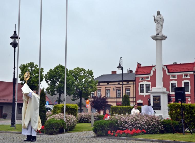 Na rynku została odmówiona litania do Najświętszego Serca Jezusowego.  Od kilku lat w uroczystość Najświętszego Serca Pana Jezusa na rynku wybrzmiewają - tak jak w dniu poświęcenia figury - słowa aktu zawierzenia. W szczególnym czasie doświadczania przez nas epidemii zostały wypowiedziane przez ks. proboszcza. Przypomniały nam one o zobowiązaniach przyjętych przez naszych przodków, ale  jakże  aktualnych dla nas  żyjących współcześnie. Przypomnijmy fragment tego aktu poświęcenia się miasta:  „Przychodzimy więc dzisiaj, by uznać całkowite panowanie Twoje nad miastem naszem. Chcemy odtąd Twojem życiem żyć, chcemy w sobie te cnoty pielęgnować, za które już tu na ziemi pokój obiecałeś(...). Panuj więc nad naszym rozumem przez prostotę wiary, panuj też przez swa miłość nad sercami naszemi, które niech całkowicie nią zapłoną. Chcemy je w Twej żarliwej miłości utrzymać przez częste przyjmowanie Komunii św. Racz, Boskie Serce, przewodzić naszym zebraniom, błogosław nasze duchowne i doczesne przedsięwzięcia, rozpraszaj nasze troski, uświęcaj nasze pociechy i łagódź nasze cierpienia”.