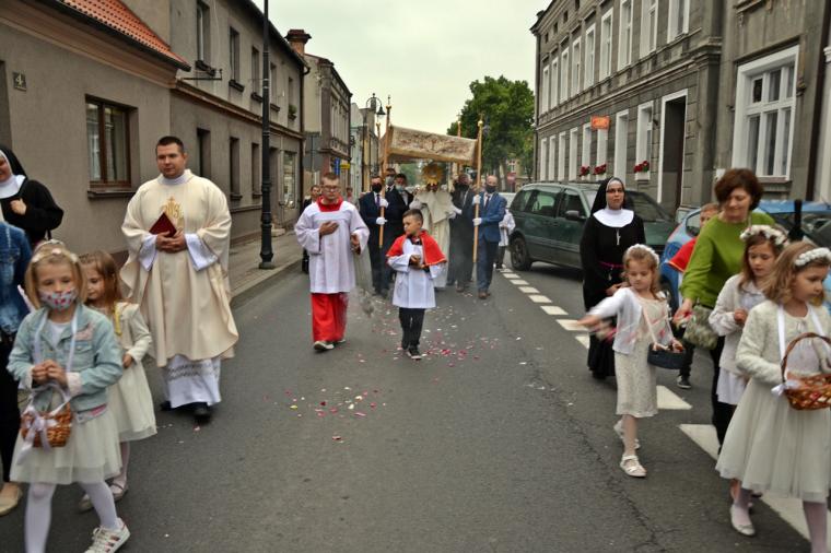 Po Mszy Świętej udaliśmy się w procesji  z Najświętszym Sakramentem na Rynek.  Nie mogło zabraknąć sztandarów, feretronów, dzieci niosących poduszki z symbolami eucharystycznymi i oczywiście dziewczynek sypiących kwiatki przed  niesionym przez kapłana w monstrancji Jezusem ukrytym pod postacią Chleba.