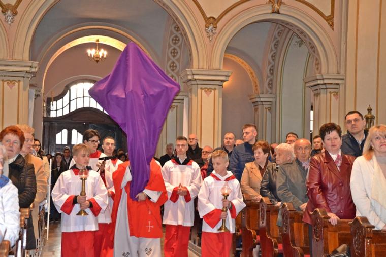 Usłyszane podczas tej liturgii słowa zapewne zachęciły nas do refleksji nad miejscem krzyża w życiu i dodały sił do zmagania się z naszymi krzyżami. Zapewne każdy z obecnych w kościele chce być godnym Chrystusa. Po modlitwie powszechnej nastąpiło uroczyste wprowadzenie i odsłonięcie krzyża oraz jego adoracja. Najpierw uczcili krzyż kapłani, siostry zakonne, ministranci. Po zakończonej liturgii przez całą noc i kolejny dzień taką okazję będą mieli wszyscy wierni. Dodajmy, że krzyż ten niedawno powrócił do kościoła po przeprowadzonych pracach renowacyjnych. Prezentuje się teraz pięknie.