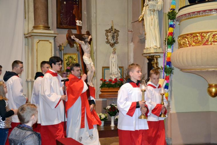 Liturgii Wielkopiątkowej przewodniczył ks. kan. Krzysztof Ordziniak. Niezwykła cisza i modlitewna zaduma zapanowała w kościele, gdy kapłan w tzw. geście właściwym Wielkiego Piątku leżał krzyżem przed ołtarzem. Podczas liturgii wielkopiątkowej odczytany został opis Męki i Śmierci Pana Jezusa. Podczas liturgii wielkopiątkowej kilka słów refleksji na temat krzyża w życiu człowieka skierował do licznie zebranych w świątyni wiernych ks. kan. Krzysztof. Kapłan zaakcentował, że Wielki Piątek jest dniem krzyża. Wskazał, że Kościół zatrzymuje się, aby ukazać ludziom cenę, za jaka Chrystus nas zbawił. Dodał jednak, że milczenie Wielkiego Piątku nie jest milczeniem rozpaczy, ale zadumy i refleksji nad miłością, która jest zdolna do największej ofiary. Kaznodzieja zachęcał zebranych do modlitwy i postawienia sobie pytania, czy potrafimy przyjąć krzyż. Krzyż, jak podkreślał, stoi w centrum Liturgii. Zwrócił uwagę na obnażony ołtarz, na którym brakuje obrusów, świeczników, kwiatów. Był natomiast pewien bardzo ważny gest. Powiedział: „celebrans(…) padł na twarz. To przejmujący znak modlitwy księdza leżącego na posadzce kościoła- jak podczas święceń kapłańskich. Trochę tak, jakby liturgia chciała nam przypomnieć, że bycie księdzem, bycie chrześcijaninem, jest powiązane z wejściem w tajemnicę Krzyża”. W dalszej części rozważania kapłan przywołał obraz znajdujący się w starym klasztorze. Przedstawia on Jezusa niosącego wielki krzyż, a wokół Niego wielu ludzi z małymi krzyżykami w ręku. Kapłan wskazał, że każdy człowiek ma swój krzyż. Podkreślił, że autor tego obrazu chciał ludziom przypomnieć słowa Chrystusa: „ Jeśli kto chce pójść za Mną, niech się zaprze samego siebie, niech weźmie krzyż swój i niech Mnie naśladuje”. Kontynuując, ks. proboszcz Krzysztof podkreślał potrzebę podjęcia swego krzyża i podążania z nim za Chrystusem. Wskazał na wielorakość i różnorodność krzyży, które trzeba przyjąć w swoim życie. Jest ich tak wiele, jak wielu jest ludzi. Zwrócił uwagę na krzyż samotności, zdrady, odrzucenia, choroby, nieszczęśliwych wypadków, śmierci bliskich. Kontynuując powiedział: „Krzyż ma wiele imion. Jedno jest pewne: trzeba podjąć swój krzyż, aby upodobnić się do Chrystusa. Kto nie bierze swego krzyża, nie jest Mnie godzien - mówi Jezus”. Kapłan zwrócił uwagę wiernych, że aby zrozumieć i podjąć swój krzyż, trzeba zrozumieć krzyż Chrystusa. To z niego mamy czerpać siłę i moc. W końcowej części rozważania kapłan przywołał postać Karola Antoniewicza, autora pieśni: „ W krzyżu cierpienie, w krzyżu zbawienie…”. Wskazał trudne koleje jego życia: śmierć dzieci, żony. Jego żona w czasie choroby mówiła do niego: „Karolu, trzeba głośno dziękować, a cicho cierpieć”. Po jej śmierci wstępuje do jezuitów. Ma dar przemawiania do cierpiących. W czasie epidemii z wielkim oddanie posługuje chorym. Sam się zaraża i tuż przed śmiercią pisze pieśń „ W krzyżu cierpienie, w krzyżu zbawienie, w krzyżu miłości nauka…”