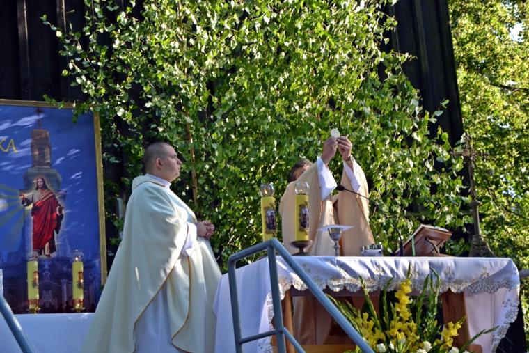 Homilię w czasie tej Eucharystii sprawowanej m.in. w intencji wszystkich obsługujących procesje i przygotowujących ołtarze wygłosił ks. kan. Krzysztof Ordziniak. Na początku kaznodzieja zauważył, że bardzo licznie zgromadzili się w tym dniu wierni w sanktuarium i wokół niego. Zaznaczył, że Chrystus, który jest bogaty w miłosierdzie pochyla się nad każdym człowiekiem, nad każdą ludzką nędzą ukazując mu swe serce pełne miłości. Ksiądz kan. Krzysztof podkreślił, że Bóg nieustannie zaprasza nas byśmy korzystali z Jego miłosierdzia, wskazując, że jest ono jedynym ratunkiem dla człowieka i świata. Zaznaczył, że współczesny człowiek bardzo potrzebuje Bożego przebaczenia, Bożej miłości i obecności. Doświadczenie Bożego miłosierdzia powinno mobilizować nas do miłości do Boga i bliźnich. Celebrans zwrócił uwagę, że Chrystus nieustannie mnoży dla nas swój Chleb. Gdy przyjmujemy Go w Komunii Świętej obdarza nas potrzebnymi siłami, doświadczamy Jego obecności, która jest źródłem otuchy, siły, odwagi.